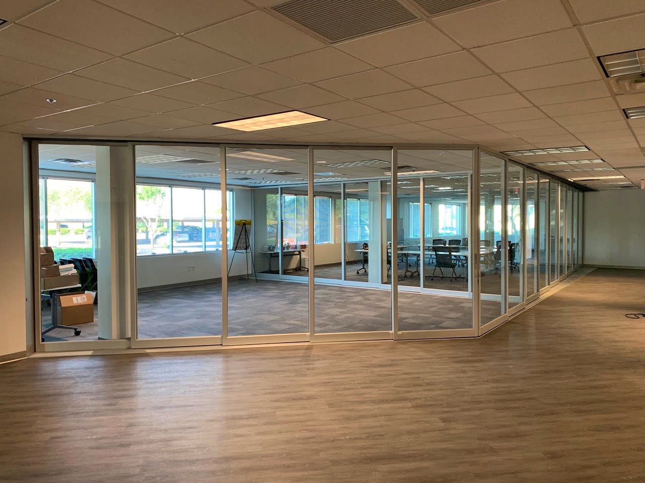 We offer glass partition systems with sliding doors that can open fully so that you can open up the space when you want or close it off for greater privacy.